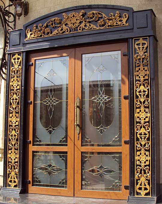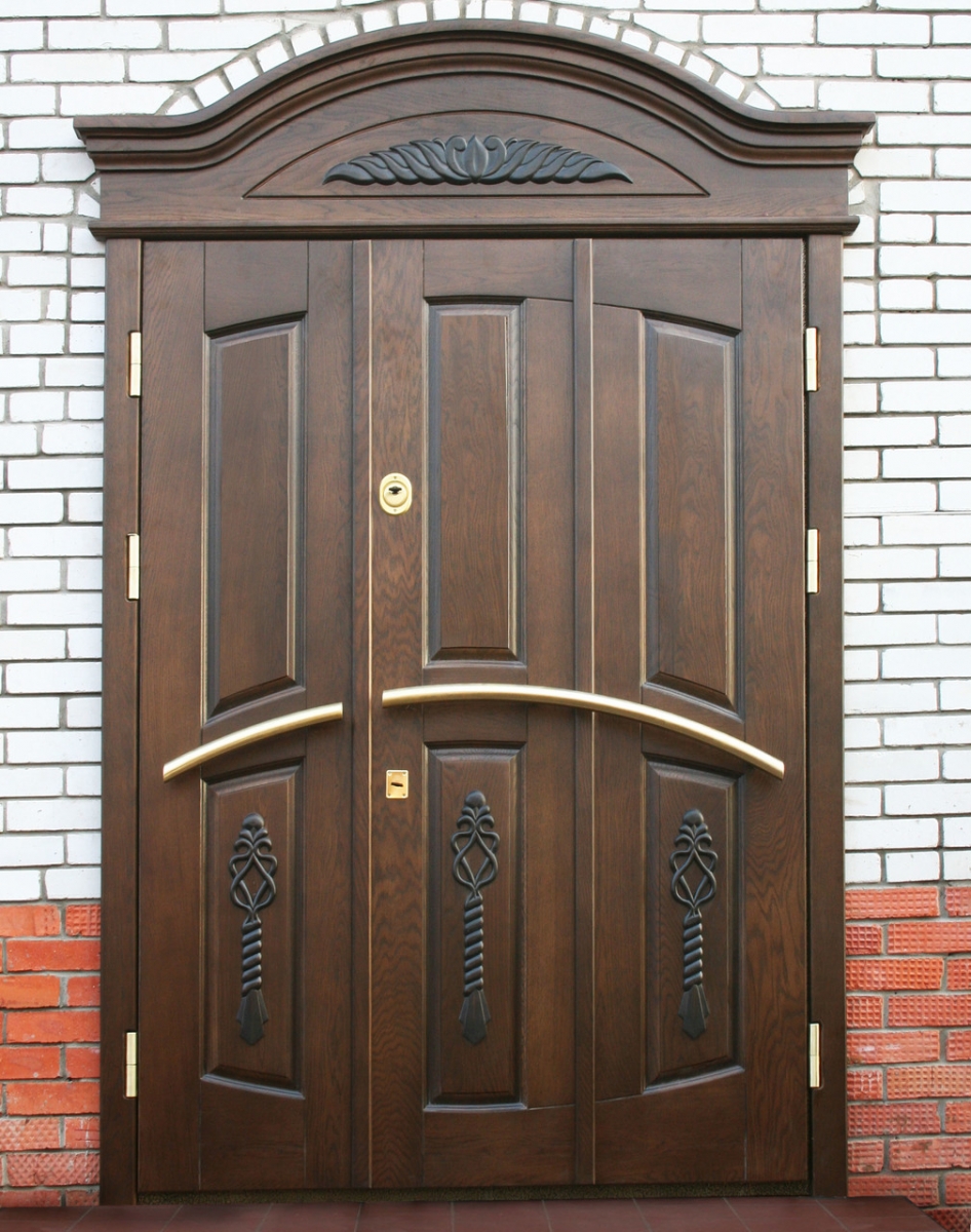 В качестве отделки используются самые разные материалы — МДФ, натуральный шпон, искусственная кожа, ламинат. Декорируются панели кованными решетками, литьем, филенками, резными элементами.